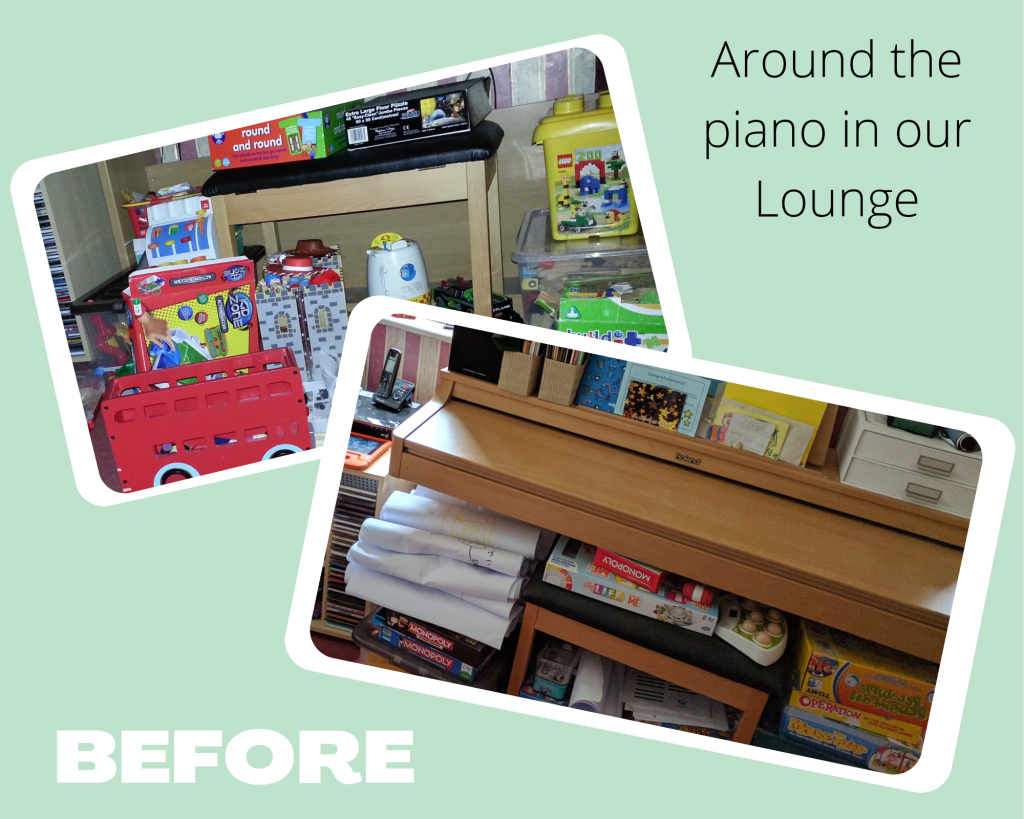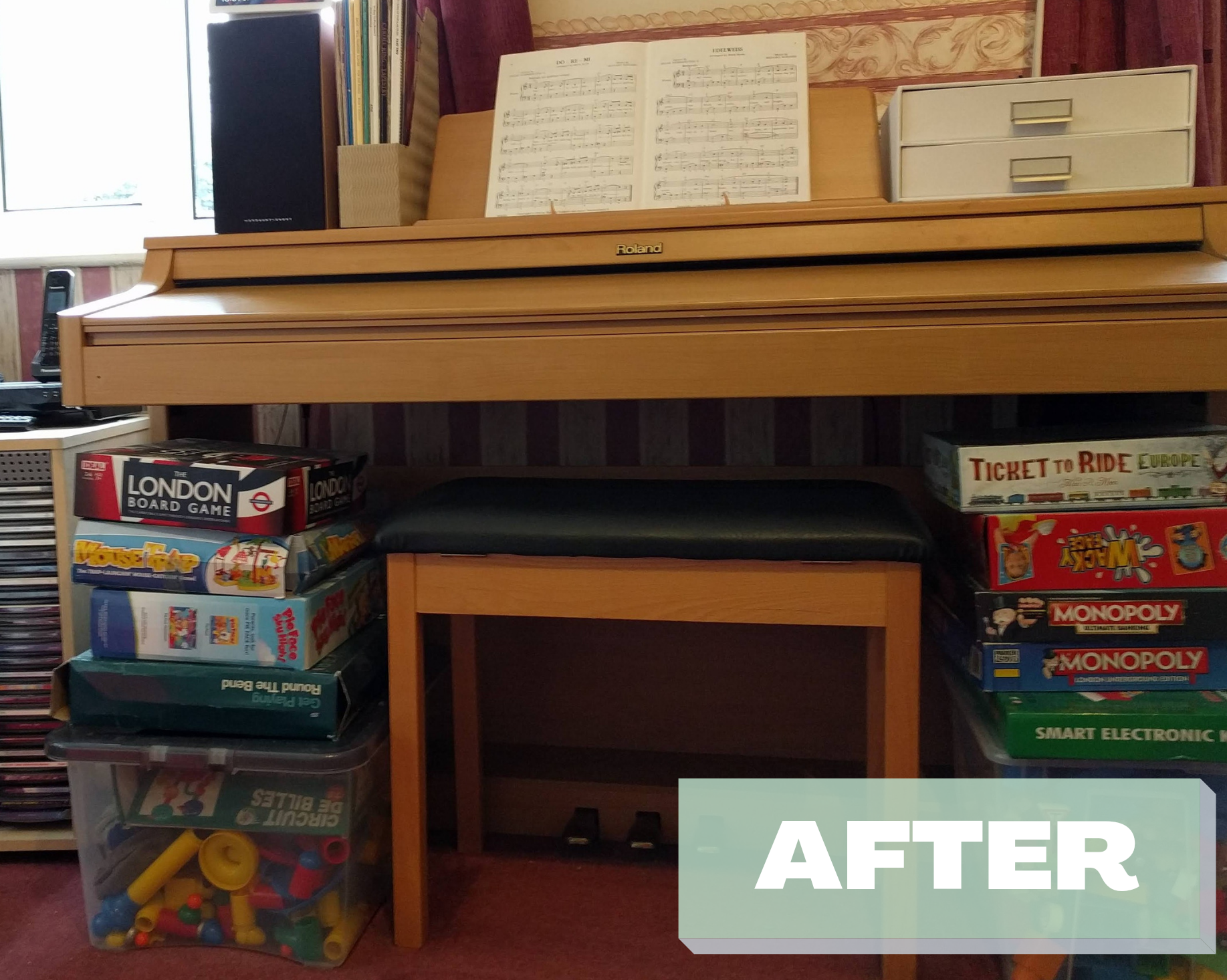 The top of the piano was covered with papers, files and other random items. Toys were stored on and around the piano stool. All of the space under the piano was taken up with more toys, board games and my son’s rolled-up artwork. Bigger toys were stored in front of the piano taking up some of our valuable lounge floor space.