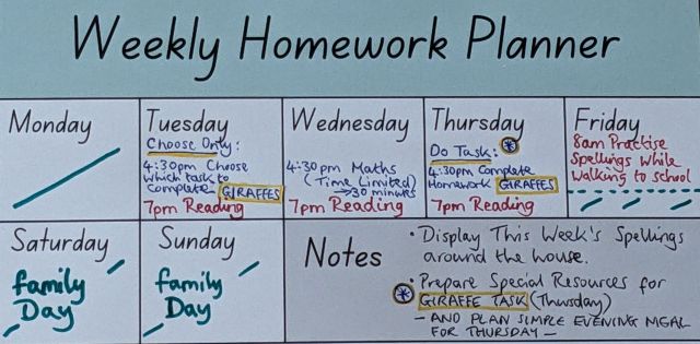 Our best approach was to try and schedule most of our son’s homework on Tuesdays, Wednesdays and Thursdays. This was the period during the week when our son accepted he was in the full flow of the school week and was more willing to focus on homework tasks.